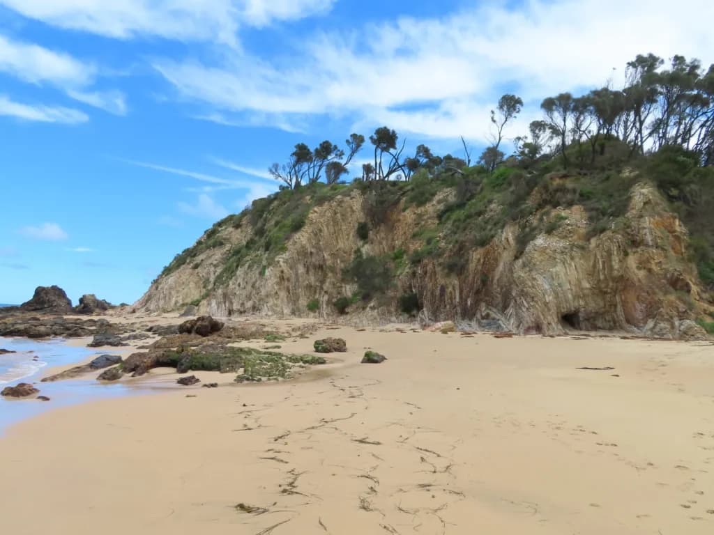 Tomakin Beach is linked to Tomakin Cove at the tombolo, and curves to the southeast, then south for 900 m to the Tomaga River mouth. The northern reefs extend 400 m to the south, while the rocks of Mossy Point protect the southern end and river mouth. These rock formations include a large peaked rock at the entrance to the river. This was named “Cone Rock “by Thomas Florance in his exploration of the area in 1828, but was apparently renamed “Mossy Rock” by early settlers as described in a report written from the memories of Mrs. Stan Stevens in the Mossy Point News on June 9th 1950: