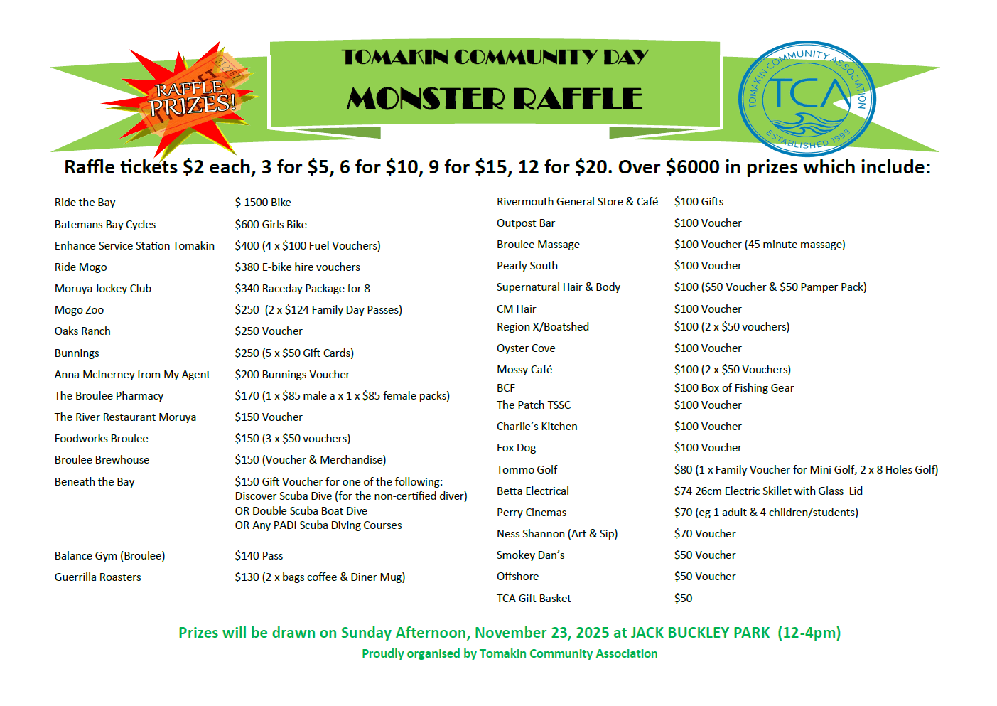 The Tomakin Community Association is holding their Community Day at Jack Buckley Park in Sunpatch Pde on Sunday November 23, from 12pm to 4pm. Please read on to find out about the details of our MONSTER RAFFLE (with almost $7,000 of prizes!) and how you can buy tickets early, our wonderful sponsors, and the fantastic attractions coming to the day!!